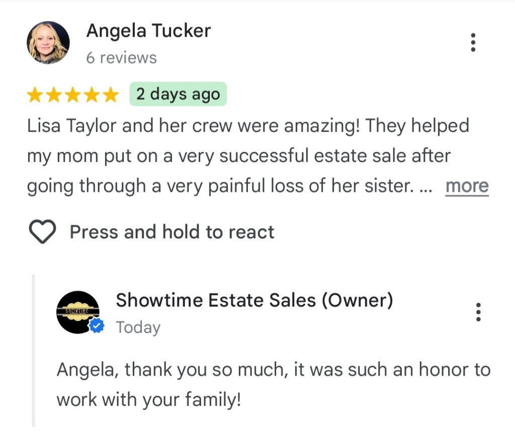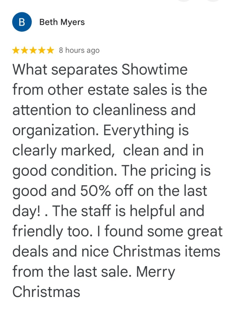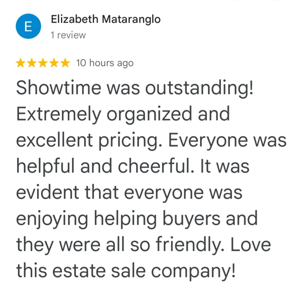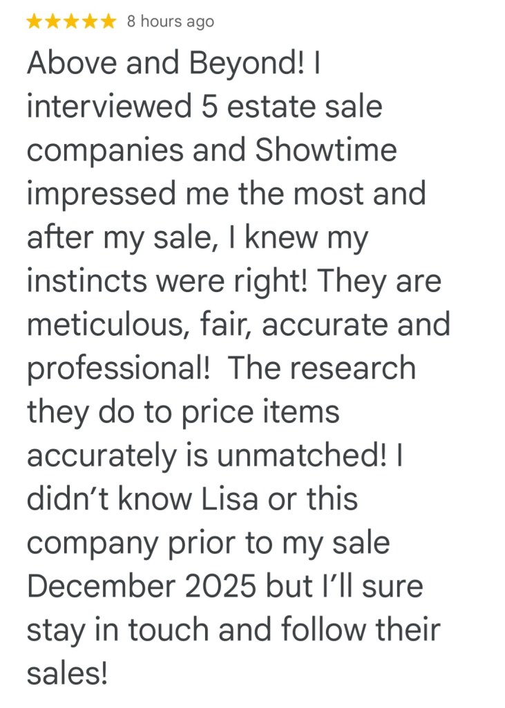 - Showtime Estate Sales brings experience and empathy in handling your estate sale needs. You can count on Lisa and her very organized team to efficiently, yet respectfully, prepare, stage, and expedite your items for highest returns. You can certainly count on her trustworthiness and honesty along with her energy in operating successful sales! -Elizabeth Hammons