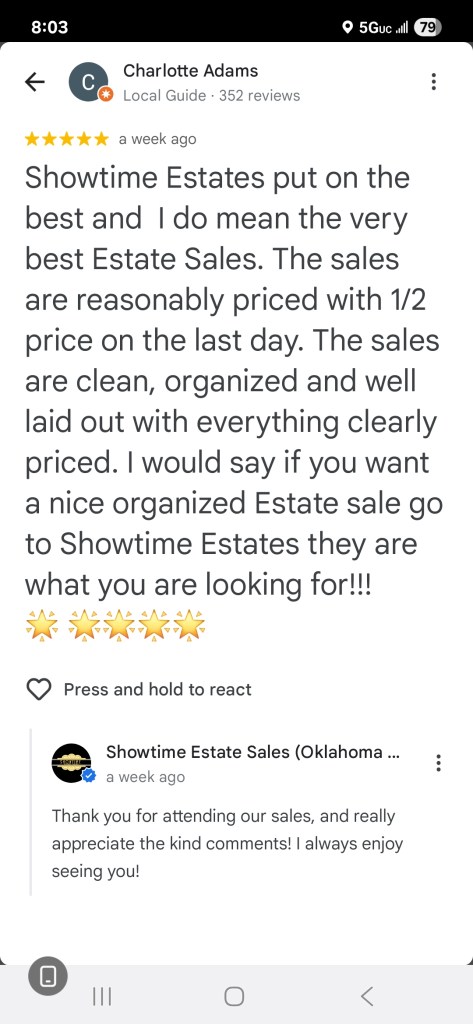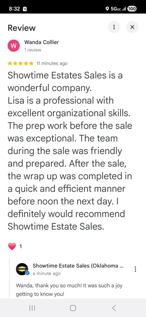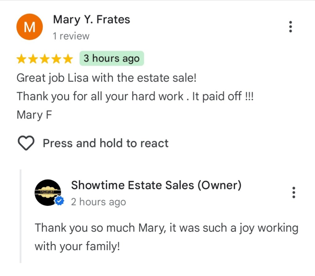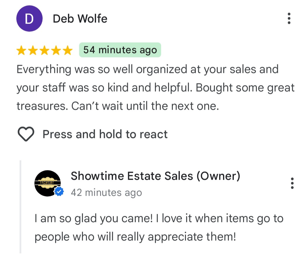 - Showtime Estate Sales brings experience and empathy in handling your estate sale needs. You can count on Lisa and her very organized team to efficiently, yet respectfully, prepare, stage, and expedite your items for highest returns. You can certainly count on her trustworthiness and honesty along with her energy in operating successful sales! -Elizabeth Hammons
